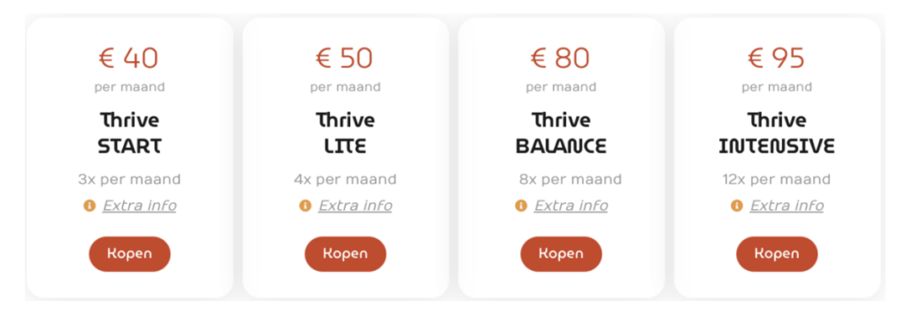 Maak direct gebruik van de voordelen van het Thrive maandabonnement; na eenmalig afsluiten, is alles geregeld en kun je langskomen wanneer het jou uitkomt. Met een abonnement ben je altijd voordeliger uit dan met een strippenkaart, zelfs als je minder vaak dan 1 keer per week gaat (met een START abonnement). Je ontvangt maandelijks automatisch 3, 4, 8 of 12 credits om lessen te volgen. Zie hieronder de verschillende abonnementen.